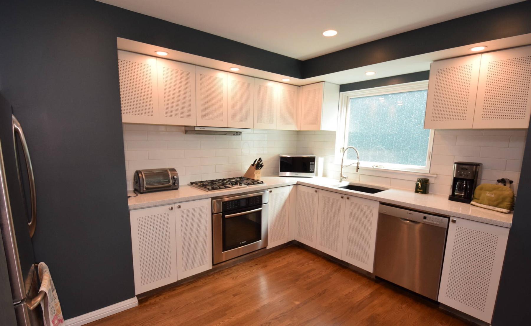 “I love it. It’s a well-planned space with plenty of room to move and create — plus modern finishes like white cabinets, stone countertops, a lovely tile backsplash and stainless appliances. There’s also a huge window over the sink that looks out on to all the mature trees, and a concealed bar around the corner.”