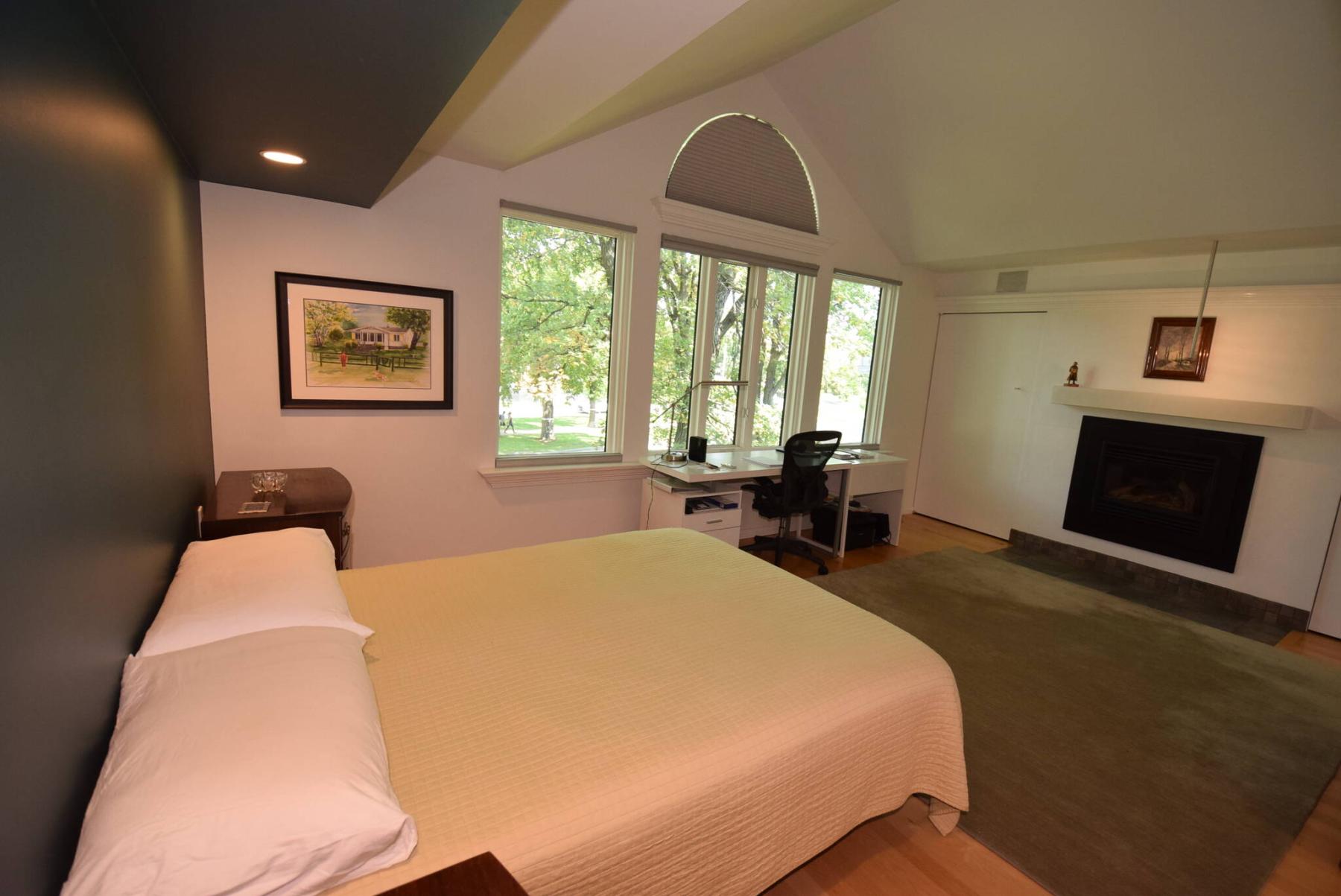 The primary bedroom boasts a vaulted ceiling, gas fireplace and a lovely view.
