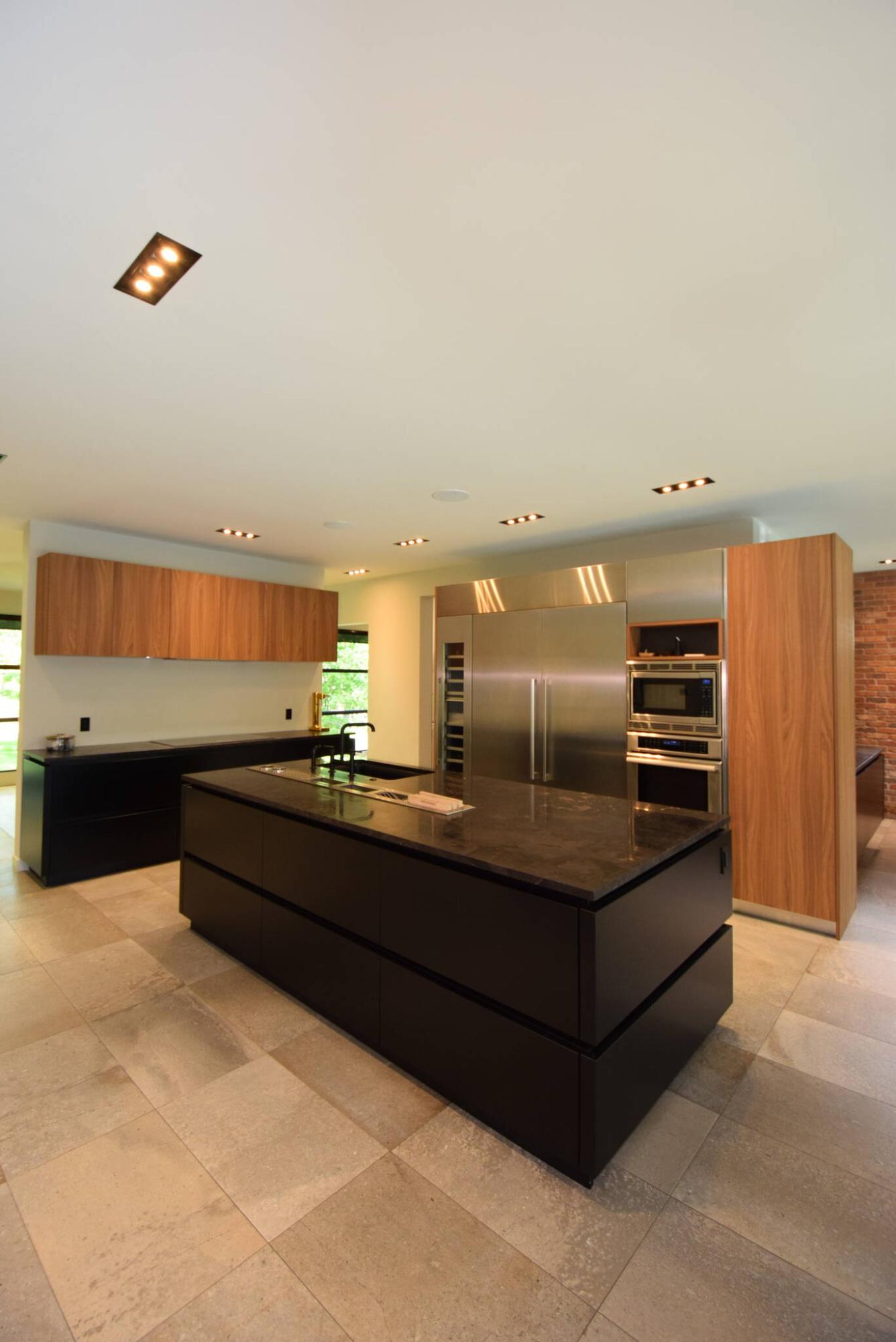 “The floor plan and finishes are unique, yet there’s plenty of function, and the style is tasteful. The gourmet kitchen is anchored by a large island, with the black island and cabinets going beautifully with the grey tile flooring,” he says. “At the same time, wood cabinetry and accents plus a double-sided gas fireplace with weathered iron cladding add warmth and texture.”